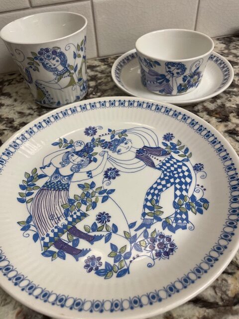 I inherited these vintage hand-painted silk screened plates, cups, etc (and tea kettle not pictured) several years ago. We brought them out to start using them earlier this year and I really love how whimsical and cute they are. You can find them on etsy with a search for “Turi Design Lotte”.