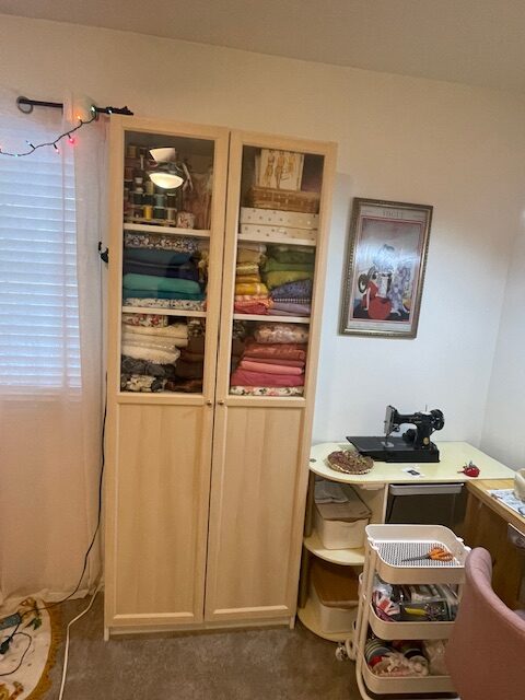 I recently purchased this storage cabinet at Ikea and I love it! It has given me a wonderful option to store and display my fabric stash so I can actually see what I have to work with. When Joann Fabrics was liquidating I tried to stock up, but until this storage option, the fabrics were stored in boxes where I couldn’t easily access them. I love this!