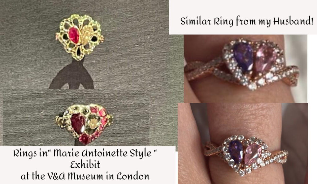 This heart ring, which I saw and took pictures of at the V&A’s “Marie Antoinette Style Exhibit” struck me, because they looked so modern! These were not Marie Antoinette’s own rings (most of her items were lost in history) however these were from the time period. For Christmas my husband gave me this very special ring he customized in rose gold, and with our birth stones (from Jeulia). It brings me delight to look at it 🙂