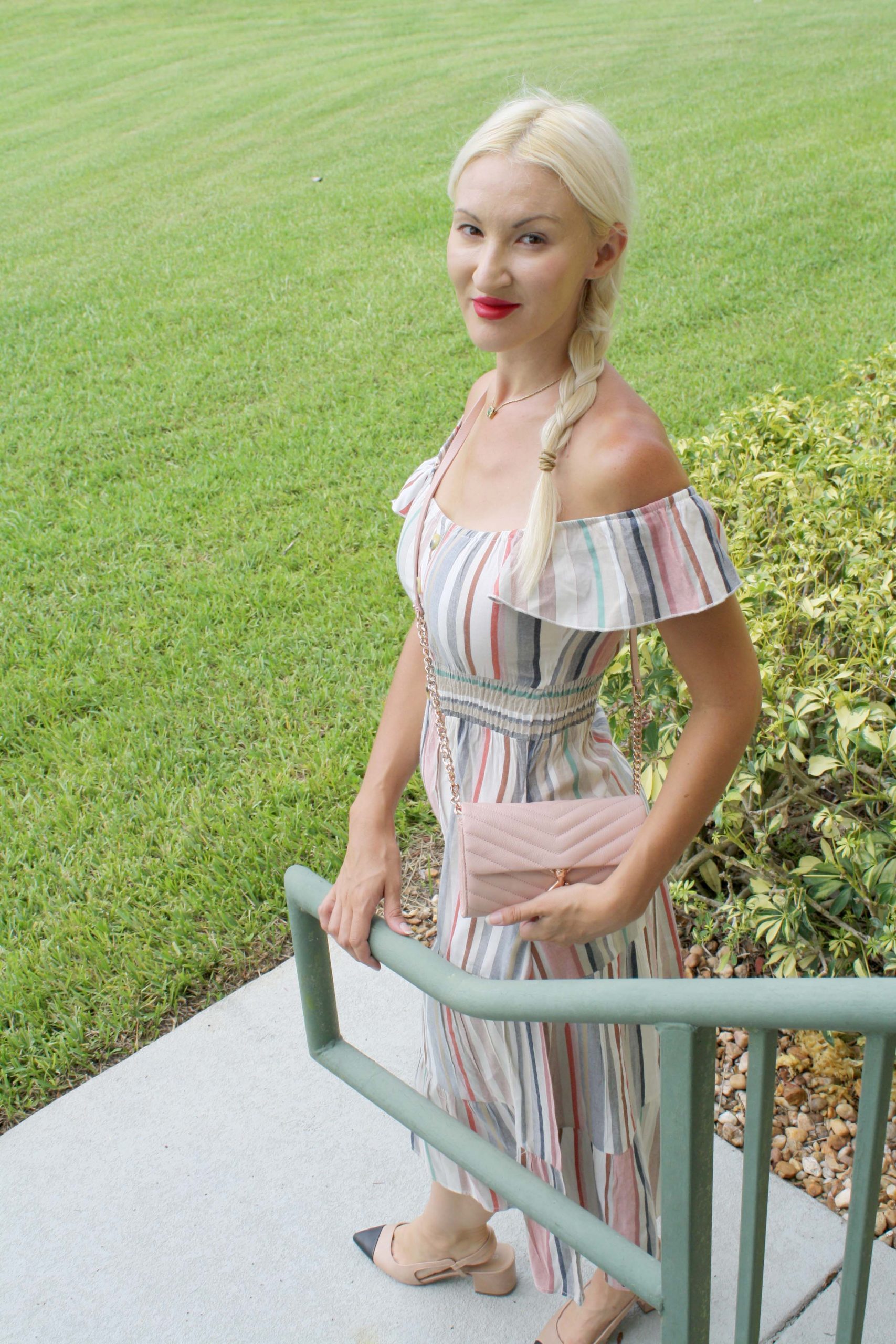 I love the ballet pink color of this Rebecca Minkoff, “wallet-on-a- chain” purse. It is a shade of pink that is close to light beige,