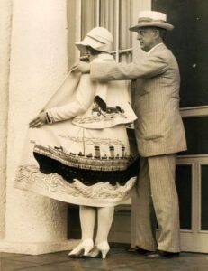I was bursting with excitement when Cunard brought back their Transatlantic Fashion Week crossing on the Queen Mary 2, and immediately I knew what I wanted to create for the voyage! I had once come upon this image of a lady from the 1920’s wearing a novelty ocean liner coat. It had left a lasting impression on me, and I knew recreating it would be a terrific project for me. The project would be half sewing and half painting.