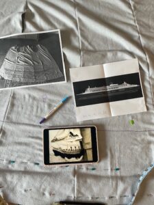First I sewed together the major panels of the coat so I could get to work on painting. My husband found a very nice photograph of QM2 and had it printed out large for me as a reference. Then I just eyeballed it and roughed out a sketch. First on a photograph of the fabric, then on the fabric itself.