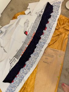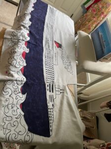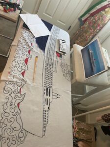 I used fabric markers and fabric paints to finish the ship painting, and it took over a month.