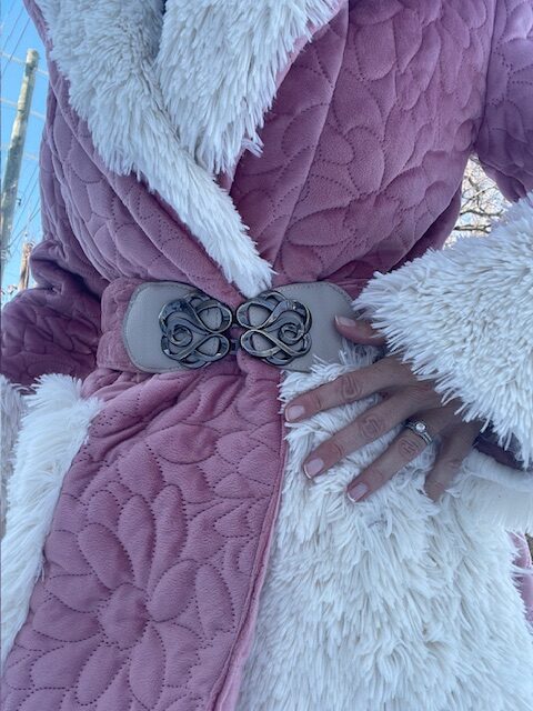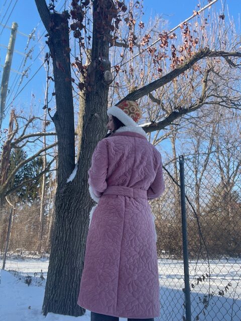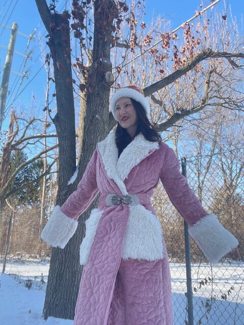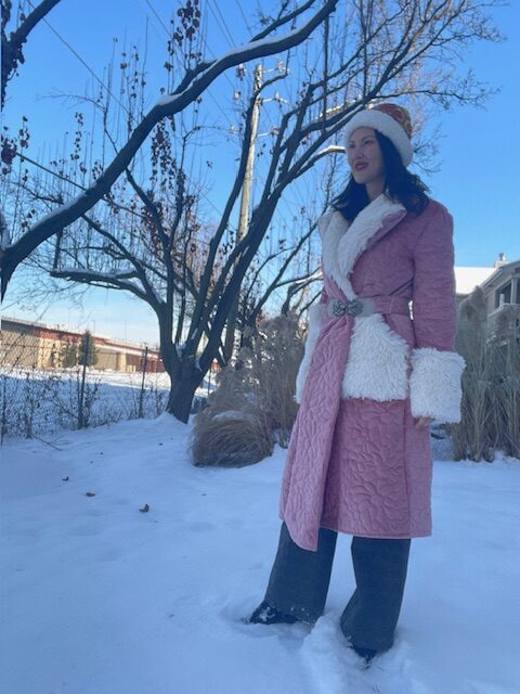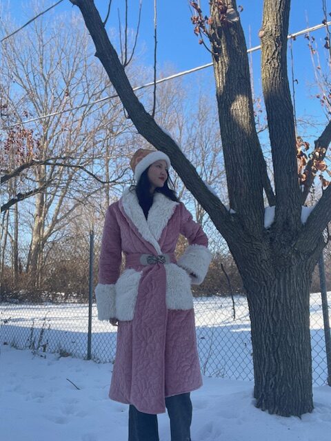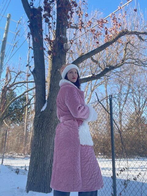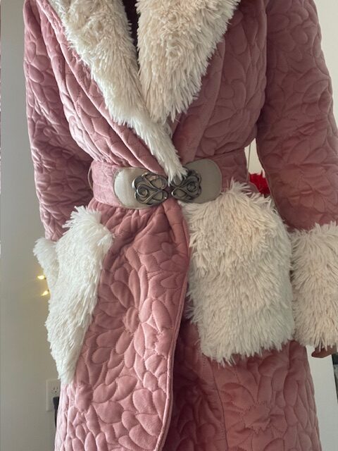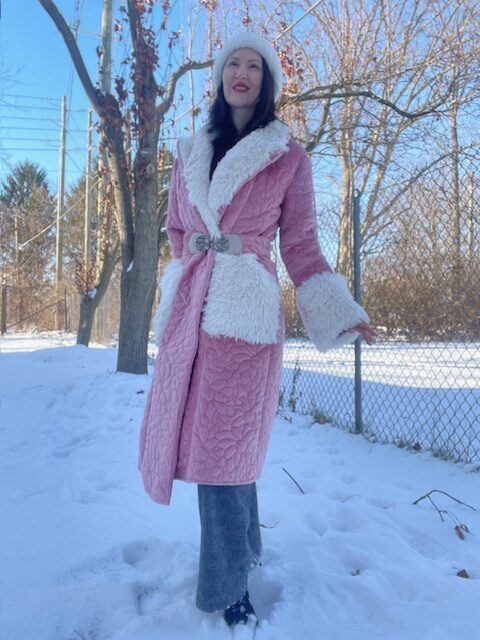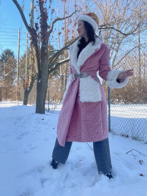 I came upon a photo of this coat, and instantly loved it! It has a glorious 1970’s vibe, the pink velour color was perfect for my “deep autumn” color season palette, and the creamy soft texture of the shearling was enticingly cozy looking. The cuffs and fur pockets were top notch! I just adored this feminine coat. I did not like the boxy oversized cut of it, but I saved the photo of it for future sewing inspiration.