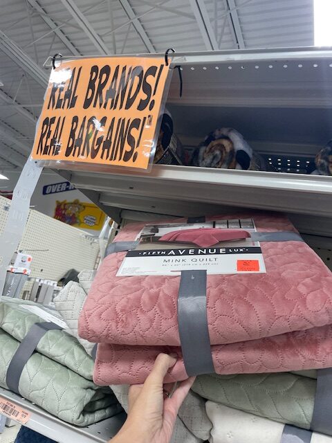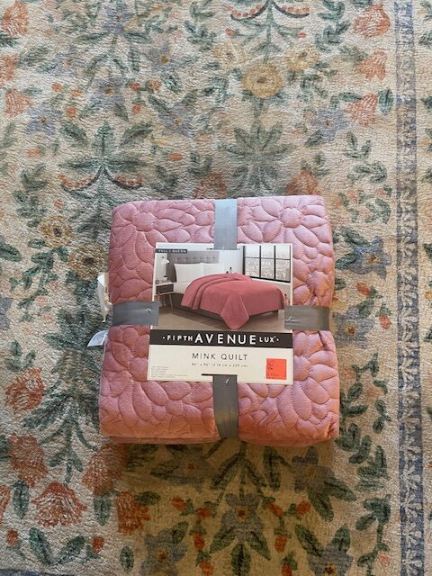 A few weeks later, I was in “Ollie’s Outlet” with my husband, when inspiration suddenly hit me! Yes, in the most surprising place, there was my perfect fabric for my “dream” LoveShackFancy coat! Not only was the velour the exact perfect shade of pink, but it was even quilted with a lovely floral motif and under $20. Perfect.