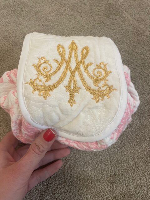 I purchased the embroidery file from a lady on Etsy (here) and a wonderful place in Bowling Green, Ohio called “3 chords” did the embroidery work onto the fabric I provided.