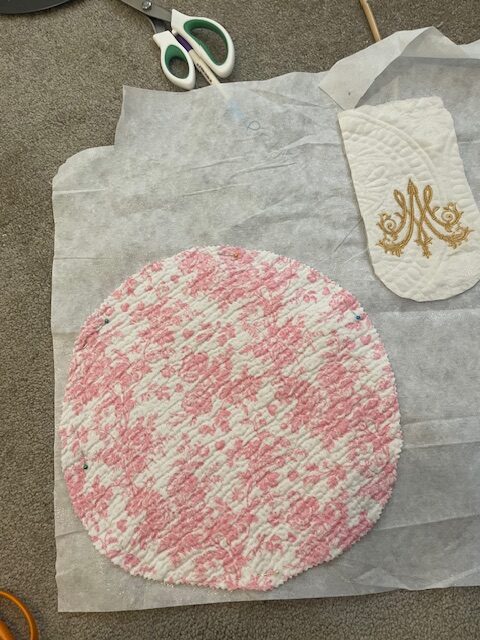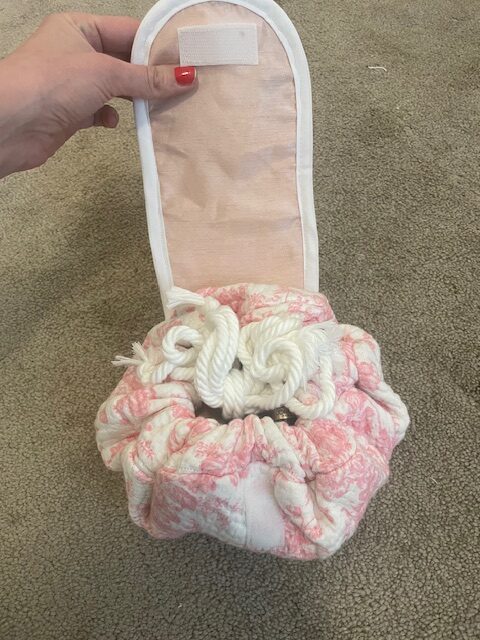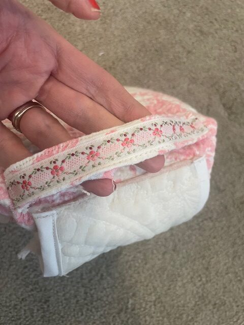 I used a very pretty pink toile print fabric for this, and believe it or not, its a kitchen towel from Marshalls! It’s so hard to find fabric now that Joanns closed, but this was a fun creative option, and inexpensive.