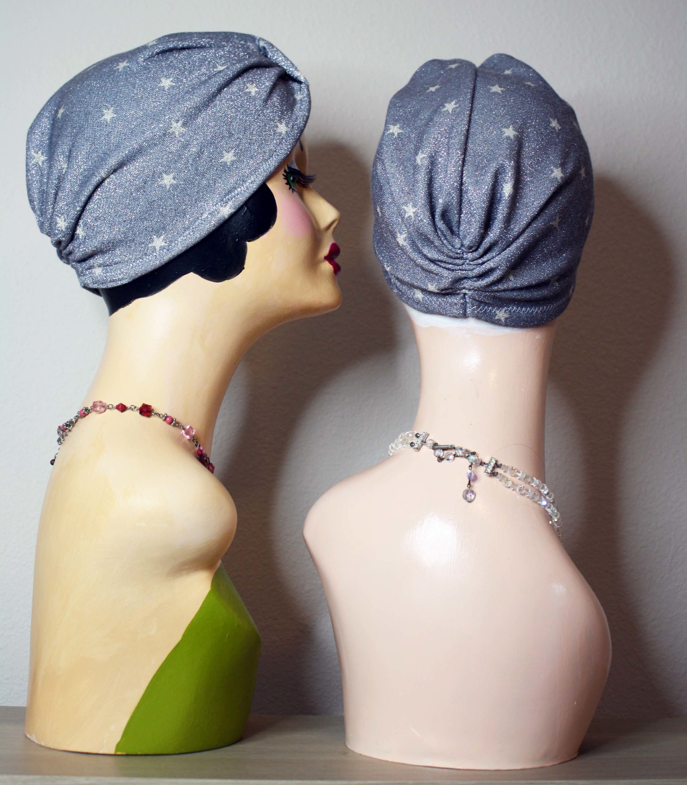New Handmade hats have been added to my etsy shop. These vintage inspired turbans feature shiny silver material with white stars. Available at https://www.etsy.com/shop/FashionedByAdrianne