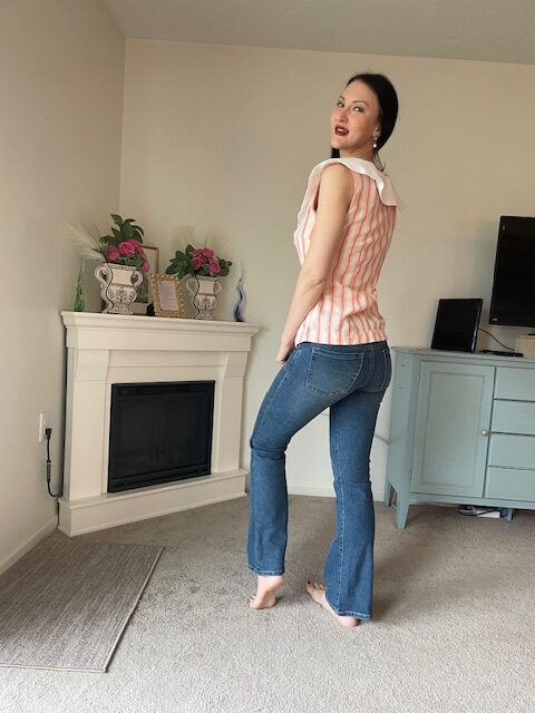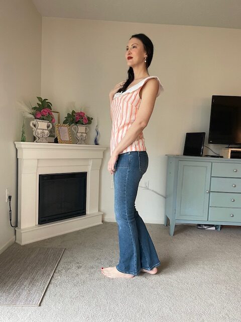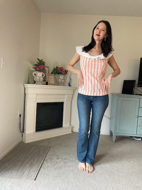 I love how this little spring time blouse turned out! This is New Look 6808, view F (link to sewing pattern). It features a rounded collar with a sailor tie/ knot at center front. I used a, orange and white striped fabric from Joann’s, and the collar is actually made from cutting up a blouse from Goodwill which had a nice textured cotton fabric. The collar is interfaced. The pattern called for a side zipper, but I did not actually need one to get this on and off.