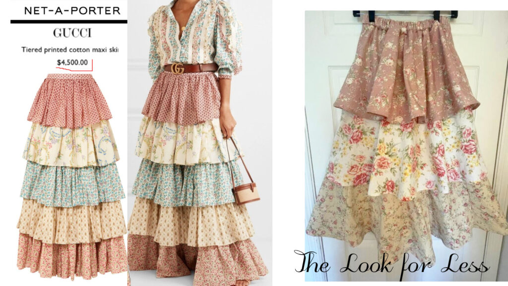 What was really cool is that I picked out these fabrics for my tiered skirt, and once I got back home I was looking on Pinterest at tiered skirts. I came across this skirt by Gucci, and it is so similar to the fabrics I selected! Uncanny that I found this after and not before. Maybe I saw this in the past and had it subconsciously in my mind? Regardless, what a nice “Look for Less” it turned out to be!