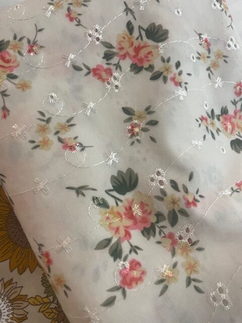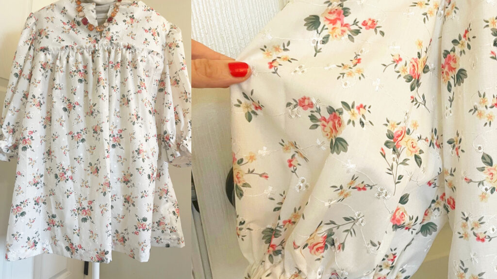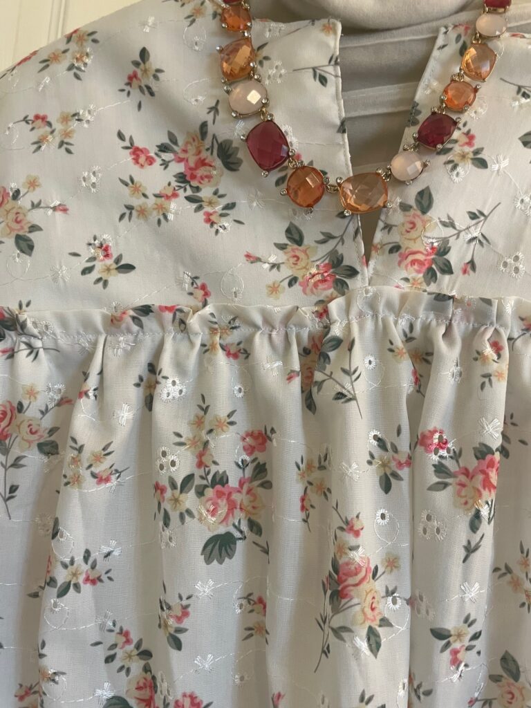 Piece 2 Is a delightful eyelet printed with flowers. The gathered puff shoulders and balloon sleeves are a nice feminine touch.