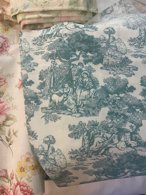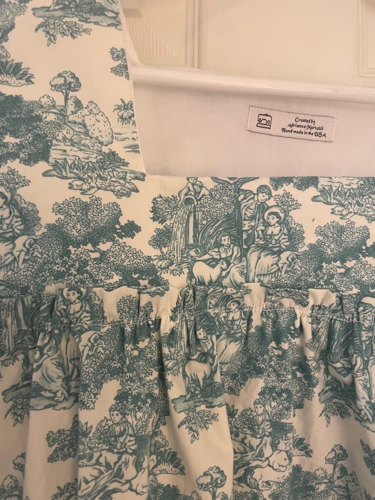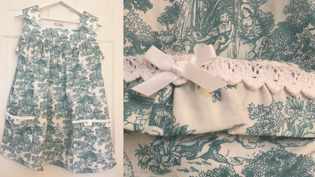 Piece one, a turquoise on white, Toile De Jouy patterned fabric. This tunic features a square neckline, gathered yolk, and pockets with lace and bow details.