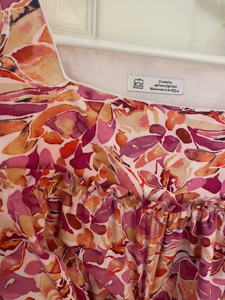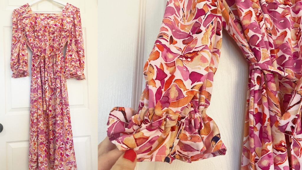 Piece 3, a pink dress in a watercolor print, with puff sleeves and ruffled yolk.